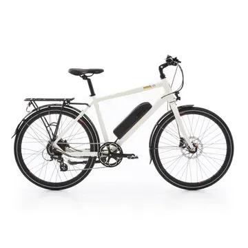 ButtonElectric city bike, equipped with reliable hydraulic Shimano disc brakes. Designed for city commutes, it comes fully equipped with a rear rack, mudguards, and lights.